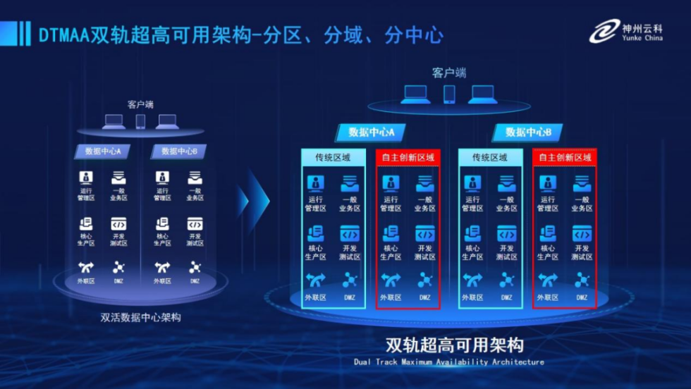 为帮助金融客户更好地应对数字经济时代对可持续性的高要求,实现“信创”与“数字化”齐头并进,芒果体育推出了双轨超高可用架构。该架构在双活数据中心的分区调度基础上,增加信创域和非信创域的分域调度,实行信创域与传统域应用全量部署,使双中心运营变为双中心四区域并行运行,互为多活,将“0到1”的单轨建设道路变为分区分域协同的多活双轨超高可用架构。帮助客户在新架构下,保障“信创”的同时解决性能瓶颈,提升稳定性,保证应用可持续性,最终实现信创区域和非信创区域的平滑过渡,完成国产化替代目标。