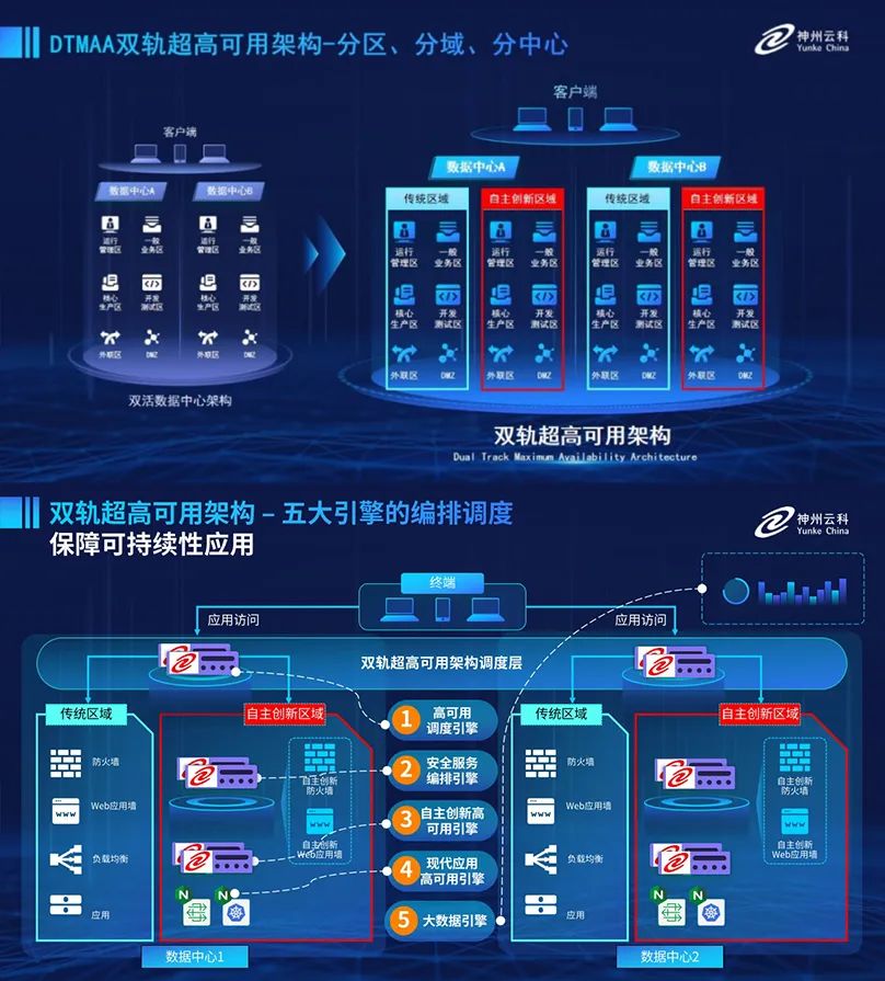 为助力银行业务高质量发展,更好地应对数字经济时代对可持续性的高要求,实现“信创”与“数字化”齐头并进,芒果体育创新性的推出了双轨超高可用架构。该架构在双活数据中心的分区调度基础上,增加信创域和非信创域的分域调度,实行信创域与传统域应用全量部署,使双中心运营变为双中心四区域并行运行,互为多活,将“0到1”的单轨建设道路变为分区分域协同的多活双轨超高可用架构。帮助客户在新架构下,保障“信创”的同时解决性能瓶颈,提升稳定性,保证应用可持续性,最终实现信创区域和非信创区域的平滑过渡,完成国产化替代目标。