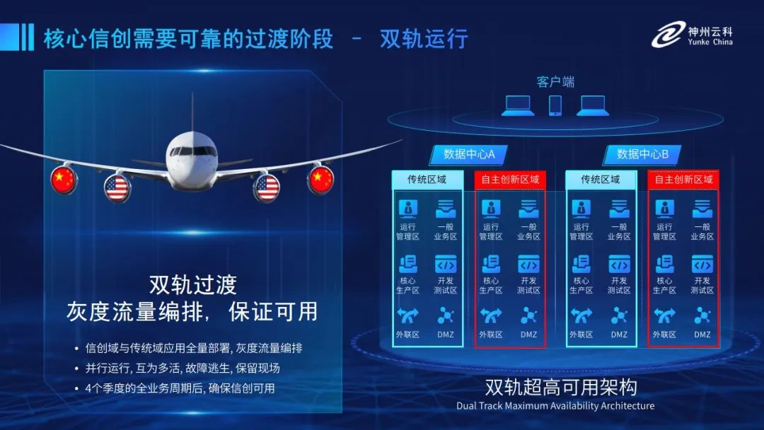 为帮助客户更好地应对数字经济时代对应用可持续性的高要求,实现信创与数字化兼得,芒果体育推出了双轨超高可用架构。双轨超高可用架构在双活数据中心的分区调度基础上,增加信创域和非信创域的分域调度,实行信创域与传统域应用全量部署,使双中心运营变为双中心四区域并行运行,互为多活,将传统架构变为分区分域协同的多活双轨超高可用架构。帮助客户在新架构下,保障“信创”的同时解决性能瓶颈,提升稳定性,保证应用可持续性,最终实现信创区域和非信创区域的平滑过渡,完成国产化替代目标。”